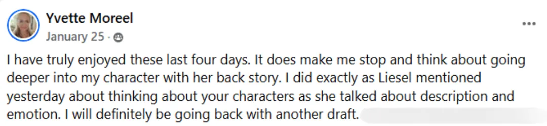 "I had no plans at the start of this course and I now feel like I have enough to get started. Thank you, Liesel Hill, for this wonderful training."