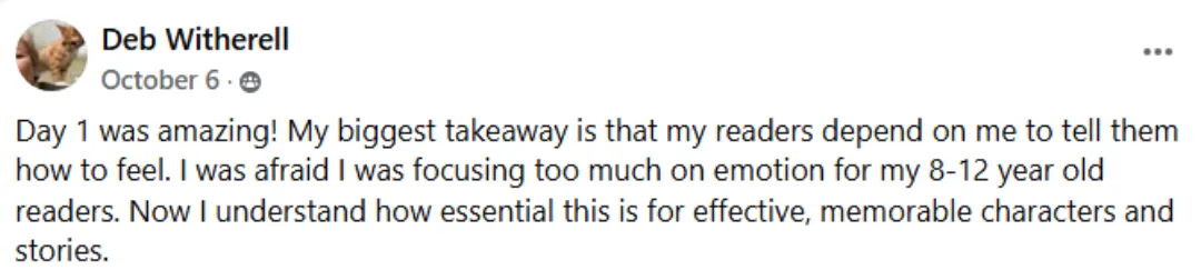 I focus on the thing that TRULY hooks the reader (emotion) and step by step, tactical processes that will help you actually channel your story out of your subconscious mind and onto the page.